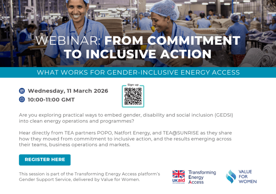 This webinar is part of the Transforming Energy Access platform’s Gender Support Service, delivered by Value for Women.